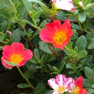 ポーチュラカ絞りに赤が出て来ました‼️ ❤️の花弁に赤ちゃん発見(^◎^) 見ずらいですが 🦗 暑さに負けないで〜 今日から五輪 ソフトボール予選 が始まります🇯🇵対🇦🇺 又熱くなりますね💦