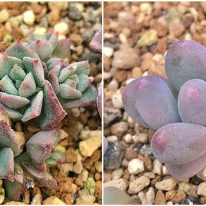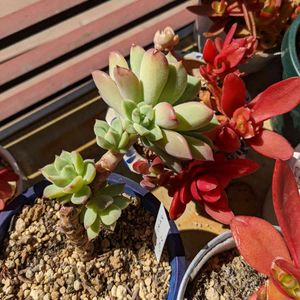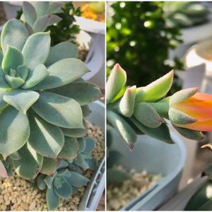 こんにちは☘ ちょっとモケモケなクイテンシス♡ 欲しくてメルカリで買ったら、おまけまでつけてもらえました🎵 右下 クイテンシス 左下 イリア 左上 カリフォルニアサンセット 右上 オウレイ 色んな色で寄せ植え☘キレイ✨✨