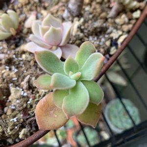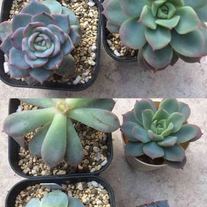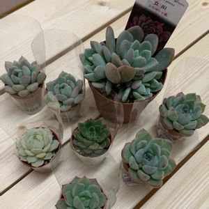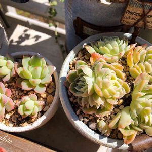 エケベリア系の鉢 カクトロコの札にはエケベリア属って書いてあるけど、ネットで見るとエケベリアと他の交配種って書いてあるところもあるからよくわからない…🌱