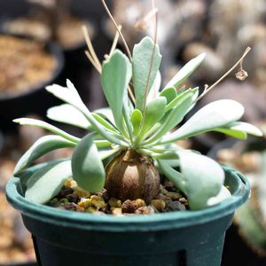 オトンナ・hyb ユーフォルビオイデス(父)×ヘレー(母) ヘレーが入ると塊根が扁平で饅頭の形です。