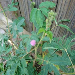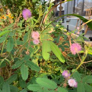 おじぎ草、今年も種から育ちました!パッションフルーツのプランターの端に種を植えたけど、こんなにかわいい花がひっそり咲きました✨