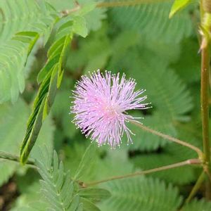 おじぎ草の花が咲きました。 触ったら 茎のトゲトゲが刺さり とても痛かった(T-T) 攻撃的な植物だったのね 夕方は 葉っぱが全ておやすみ状態。