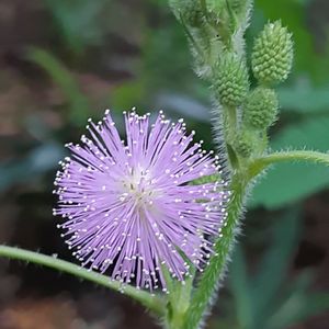おじぎ草開花です。 まるでポンポンのような🌸 手前の緑の粒々がつぼみです。 今年は例年より、早く開花🌸 最近、涼しくなったからでしょうか?