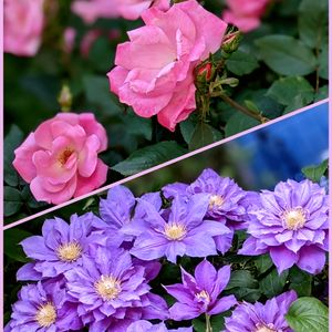 🌹ピンクノックアウトさん、咲いてきました クレマチスとコラボ写真を撮ろうと、鉢を動かしたんですが、上手くいかず...🐸💦 アプリでコラボです📱 文明の利器(?)に頼りました( ´•ᴗ•ก)💦