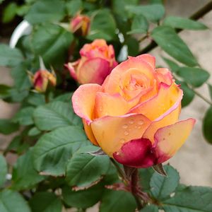 こんなに蒸し暑いのに、一気に咲き出した、バラ。生産者さんのオリジナルさざえ。 蛍光ピンクの縁どりで、光ってる感じ。 たくさんのつぼみが出番待ち、雨に当たらないよう軒下に入れてしまった。