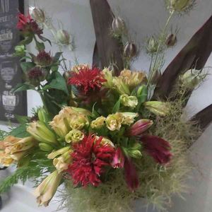 おはようございます☀️😃❗ 道の駅で買ってきた花達~❤️ ベルガモットとスモークツリーが一番に目について、それに合わせて、花選びしました➰🎵 これで850円なり👀‼️ 取り敢えずゴミ箱に水はって、適当に入れてみたけど、大きな器が見当たらず~( ´△`) これで良いかな~(笑)