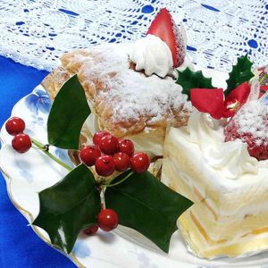 クリスマスイブ🎄🎅🎁✨のケーキ🍰は息子のケーキ屋さんで♫ 我が家は小人数なのでこれだけ😉 お庭のヤバネヒイラギモチをお皿へ🎶 ご近所のおじさまが趣味で編まれたレースのテーブルクロスをかけてイブらしくしてみました ☆⌒(*^-゜)v