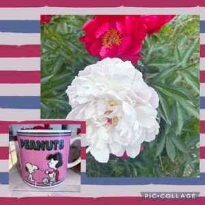 今日のお花 「芍薬🤍❤️」さんと 毎月2日はスヌーピーの日 ピンク🩷のコップ、可愛い💕 🏷️今日のお花 🏷️毎月2日はスヌーピーの日 🏷️つなぐ、つながる