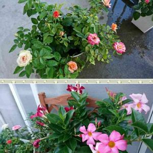 上の写真は先日購入した見切り品コーナーにあったミニバラの寄せ植え。 枯れ枝や土の上に積もっていた落ち葉も綺麗に取り除きましたヽ(・∀・)ノ 一体何種類のミニバラが寄せ植えされているのやら………(;・ω・) 下の写真はマンデビラ3種寄せ植えの鉢。(*´ω`*) 赤い花がそっぽ向いてしまってます(笑)(*´ω`*)
