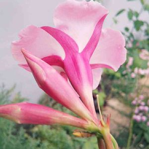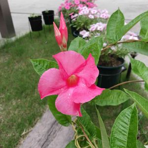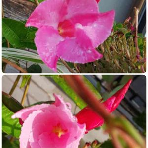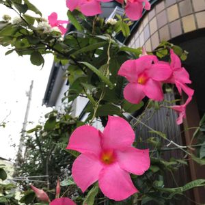 職場の近くのお宅で咲いているマンデビラ🥰 ピンクでかわいい😍 もう室内に取り込まないといけないけど咲いてるから、と仰っていました。 タイタンビカスに似てますね〜🎵