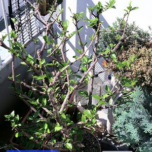 明るい陽射しを浴びて@13号鉢、ベランダ♨️ ハイビスカス🌺老10年生👴💦 年末に毎年、大剪定で室内冬越し、旧葉は落ちて今の葉っぱ🍃はすべて新品です✨ ボチボチ蕾をつけ出すでしょう🎶😃 コルムナリス・グラウカ(北米ヒノキ属)🎄の新緑もきれいです🌿