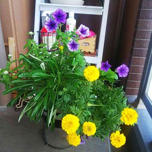 ガーデンマム・ジジ、ルドベキア・トトゴールデンなど使った寄せ植えです😃 センニチコウ・ちなつと初雪カズラは寄せ植えに使いやすい花材でおススメですよ👌