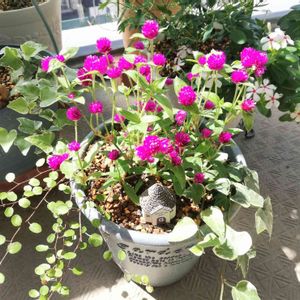 気がつけばニュアンスカラーのお花が多く、ブーゲンビリアも散ってしまって。 最近いくつか切り戻ししたのもあり、夏本番なのになんだか色合いが寂しいなぁと。 ずっと頑張っていた金魚草がついに終わりを迎えて鉢が空いたのもあり、近所のお花屋さんで気になっていた千日紅ちなつをお迎えしました☺️ (ニチニチソウモネで終わるはずだったけど、やっぱりそうはいかなかった😅) か、可愛い〜〜😍 近くで見るとさらに可愛い😍 ヘデラとワイヤープランツ少しとだけ寄せ植えしました🌱