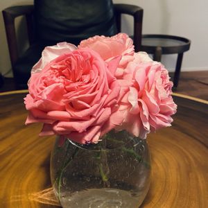 切り花にしてピンク系でいけてみました♪お部屋も良い香り💕癒されます☺️ 房咲きの品種は切り花にするときにいつも迷います😭切るか、それとも残りも咲かせるか…短く切ったら、水につけられないから😵 その点、今回生けたバラたちは一房に一輪なので助かりました😆