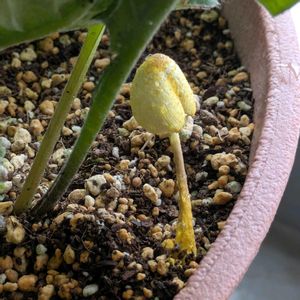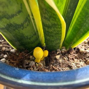 サンセベリアの根元に黄色いキノコが生えてきました。名前は分かりますか、毒はありますか。わかる方教えてください。