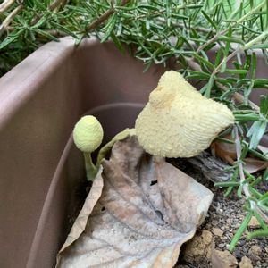 ローズマリーの根元に・・ グーグルレンズによると コガネキヌカラカサタケ🍄🟫