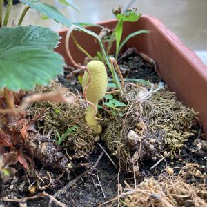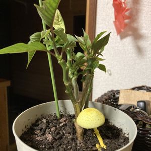 え⁉️ナニ❓なに〜❓ ペリオニア プルクラの鉢から 黄色いのがニョキニョキ〜って❗️ 2年前からずっと育てているけれど 初めましてです💦 調べてみたらキノコ🍄らしい。 「コガネキヌカラカサタケ」かなぁ?だとしたら 「お釈迦様のキノコ」「幸運を呼ぶキノコ」らしい✨✨ いい事あるのかなぁと思ってたら次男から着信📲 🚗に自転車🚲が突っ込んできたーって ダメじゃん👎うわ〜ん😭😭 当たって来たのね…宝くじ買うかぁ〜😂