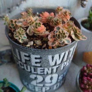 ヒダカミセバヤ 開花💓 葉っぱの色がくすんで見えるのは これから真っ赤に紅葉する準備だよ❤️ プラ鉢のまま みんとぐりーんちゃんの デカリメ缶にIN❣️ 似合うんでないかい😁