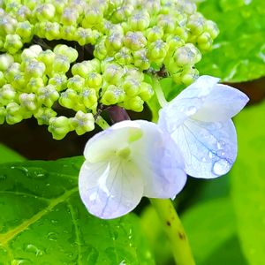 昨日梅雨入りして しっかり雨の朝です 少し小降りになったところで 雫倶楽部活動 アナベルの薄い花びらが 更に透明度を上げてます