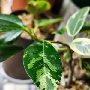 フィカス ルビキノーサ なかなか出会えなかった品種だが、今年の夏に園芸店にて発見し購入。 3,000円程度だった気がするが、もう少しお安かったかもしれない。 小さい葉にくっきりと斑が入り、なかなか可愛らしい。