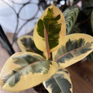 ショッピングモールの雑貨屋にて。 『フィカス』とだけ名前がついていましたが、なかなか見ない斑入り。で1000円ほどのお値段。 この斑入りは・・・フィカスアスペラパーセリーっぽい。