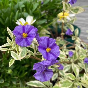 ソラナムラントネッティ バリエガータ 短く切り詰めたら咲いた! のびのび伸ばしてる子は今年も咲きそうにありません😅