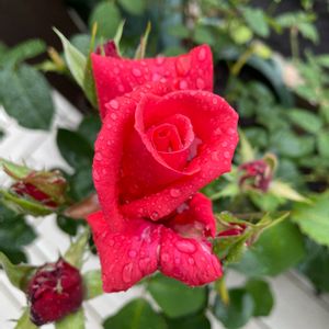 おはようございます☺️ 雨の朝です☔️ ドゥフトボルケ🌹 オレンジがかった赤い薔薇、カメラでは色合いが伝わらないのが残念な個性的な薔薇🌹