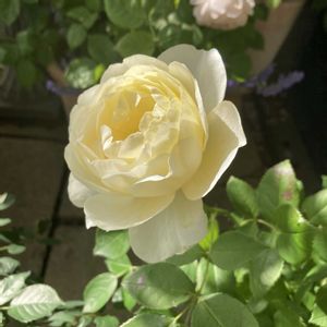 3年目開花🌹 デビットオースチン社 ナイべヴァンが咲きました🥰 棘の少ない薔薇を探していて出逢った子です💛 柔らかな丸い花弁が重なって咲き始めは柔らかな黄色からクリーム色に変わっていきます🥰 2021作なので病気や虫にも強い様です👏 去年初めて鉢埋めにして周りを西陽対策でアジサイやペンステモン ハスカーレッドでカバーしましたが今の位置に馴染んでくれた様です🙌 今年は新しくバラのお供?にペンステモン アップルブロッサムをお迎えしました😊 白に赤い差し色が可愛い子です🥰 雰囲気台無しの様な黄色の🟨は害虫とスリップス対策です😅 色はなんですが物凄い粘着で頼りになります😅✊
