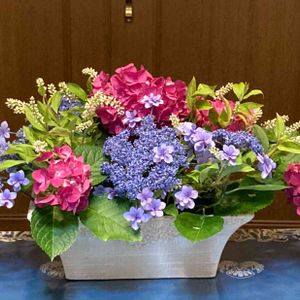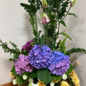 アジサイアレンジー2 庭のアジサイです。一株からなのに咲いた時期が違うと変化する色の具合も違い、きれいなグラデーションとなりました。 アジサイ、キク、スギ、ユリ