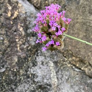 ヤナギハナガサ 別名、サンジャクバーベナ。石垣の隙間から細い茎を長く伸ばした先に花が咲いていました。サンジャクは三尺ということのようです。