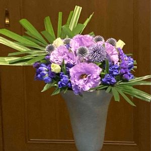 ルリタマアザミ(瑠璃玉薊) 寒色系の花を選びました。猛暑なので日持ちがするようなるべく茎を短くしてアレンジ。 ルリタマアザミ、トルコキキョウ、リンドウ、シュロ、スターチス