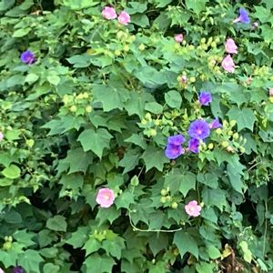 リュウキュウアサガオとフヨウ(琉球朝顔と、芙蓉) 川の対岸のリュウキュウアサガオとフヨウのコラボです。人の手でこうなったのではなく、全く自然の風景です。