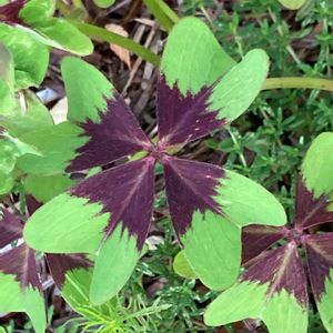 モンカタバミ(紋かたばみ) 4つ葉のクローバーと見間違うような形です。クローバーとの見分け方はクローバーは葉に白い模様が入ること。モンカタバミの花は赤いです。