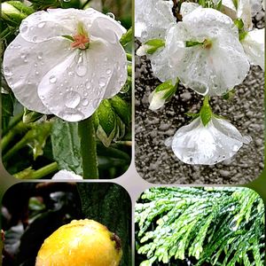【散歩で出会った雨の雫💧】 真っ白な花が、雨で濡れてびっしょり。 花びらが透き通るくらいに濡れても、健気に咲いています。 ビワの実が雨粒を乗せ、観葉植物の葉っぱにも雨の雫💧 人が育てているとはいえ、環境は自然のまま。 自然の中で、花も、葉っぱも、実も、自然を受け入れて、がんばっています❢