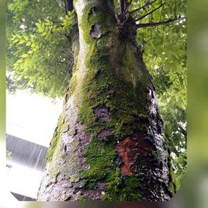 【樹木見上げ隊】 雨の中、ケヤキの木を見上げてみました。 ケヤキの木は、雨が降ると、幹が濡れると読んだので、見に行ってみたのです👮 なるほど、確かに、幹が濡れて、雨が伝って流れ落ちており、木肌の凸凹に雨の雫💧も見られました。 ケヤキの木は、上に行くほど広がっているので、枝、葉だけでは雨を受け切れず、幹にも雨がかかるのですね。 雨の中、ケヤキの木を見上げて写真を撮るのは大変です😅 ケヤキの木の下は、雨宿りには適さないということですね。