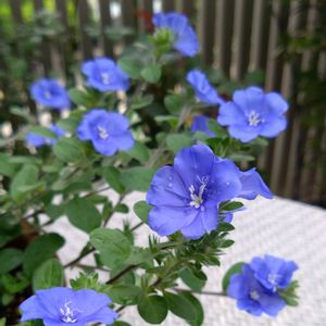 庭で鉢植えのエボルブルス ブルーラグーンが咲いています。