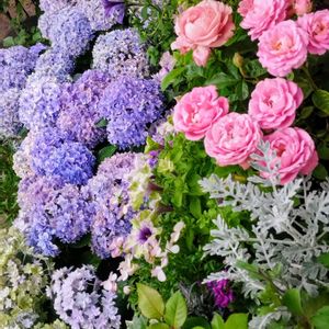❶紫陽花とペチュニアアマゾナス、薔薇エールの共演🌿 ❷アンティークカラーの素敵な薔薇エール ❸玄関前の薔薇ニューウエーブとラックスヘラ、シロタエギクの共演 ❹❺先月新たに迎えた薔薇 清流(河本バラ園)