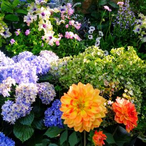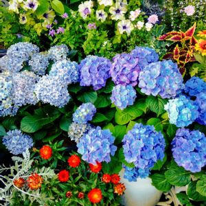 我が家の植物達🌿 ❶❷アジサイ加茂セレクション響とダリアマキシ、ペチュニアアマゾナスの共演です🪴 ❸❹長野県オリジナルアジサイいろは🌿アンティークカラーに変化して綺麗です ❺挿し木で増やした西洋アジサイ ブルースカイ