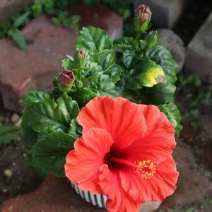 赤にした~🤭 フォロワーさんのup見ている内に欲しくなって❗️ 前回見た時は色々な色が咲いてて違う買い物してる内に買うの忘れて😂 今日行って見たらみんな剪定されてて定員さんに聞いても解らないって❗️ かろうじて赤と黄色が解って❗️ ハイビスカスと言えば赤でしょってこの子に決めました👍✨ 庭が又明るくなりましたよ✨😀✨ ハイビスカスを上手く育てるコツみたいなのありますか🤔?