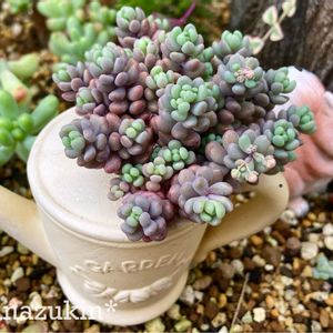 お花記録… 「玉蛋白」です。 ダシフィルム、マジョール、パープルヘイズの花はよく見ますが… 玉蛋白の花を見るのは初めてです! 玉蛋白自体は、とても良く増えるのですが、 今回もこのひとつしか咲いてないですし… お花はけっこう珍しいのでは?? 寄せ植えの中で、他のダシフィルム系と一緒に植えていたので、うっかりしたら見逃すところでした! お花自体は、まあ普通のダシフィルム系の花なのですが… ネットで検索しても、玉蛋白の花は本当にちょっとしか出てきませんでした。 となると、クリーム玉蛋白(斑入りの玉蛋白)の花なんて相当珍しいかもですね。 私がネットで検索した限りでは見つけられませんでした…。 3枚目、4枚目はリメ缶でモリモリになりすぎている玉蛋白です。 後ろの窓が隠れないように玉蛋白にしたのに、増えるとこんなになっちゃうんですね…、 手前に置いたリスが玉蛋白に圧迫されて、窮屈そうです(笑) 保険株もあるので、これはこのまま夏越しチャレンジです! こちらも、ひとつだけ花芽がついています(右手前)。 過去の様子は 🏷はなずきんバスケットセダム寄せ 🏷はなずきん窓缶 で見られます。