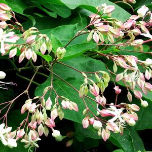 臭木(クサギ) クマツヅラ科クサギ属の落葉小高木。日当たりのよい野山の道端などに生える。葉は広卵形で対生する。花期は7~9月。枝先に大きな花序を出し、甘く香る白い花が、淡紅色の萼から突き出して咲く。秋、萼は濃い紅色になって星形に開き、中心に藍色の果実が熟す。二色効果で鳥の目を引き、種子をあちこちに運ばせる。果実や萼は染料。根は薬用。 花は良い香りだが、枝や葉に特有のにおいがあることから付いた名前。くさいといっても鼻をつくにおいではなく、ビタミンのにおいに少し似ている。 出典『里山の植物 ハンドブック』『樹木の名前』