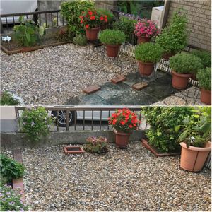 🐵昨シーズン必死で造った小庭をもうリニューアル🤩 10/31までの作業の様子 アイドルスポットを作ろうと企み🐒 左上↖️ 前回までの小庭 右上↗️ 砂利にレンガを埋め込みスポット完成✨ 左下↙️ 夜の景色 右下↘️ 朝の景色です レンガの上4箇所にお花を置いても可愛いかな?と思うしpicの様に真ん中に背の高いお花を置いても可愛らしいかな〜と思っています🐒🌱 ここの雰囲気がお洒落になるような素敵なソーラーライトが欲しいな💡