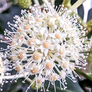 ❇️今日のお花 ヤツデ❇️ ヤツデのお花 アップで見ると シベいっぱいで美しいですね。 GSに入るまでは気にも止めなかったお花ですが、今は 毎日 出入りする時、必ず見て ウットリしています😍🤍