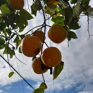 🏷️今日のお花 カキ 八珍柿(はっちんがき)原木について 明治20(1887)年頃、越後の行商人から買った柿の苗木が旧鶴岡藩士らによって山形県庄内地方で栽培されていましたが、明治42(1909)年その優秀さが認められ「平核無(ひらたねなし)」と命名、公表されました。 庄内柿が有名になるとそのルーツはどこかという本家争いが起き、新潟県は原木の所在をつきとめるために調査研究した結果、昭和6(1931)年川崎家の柿の木が接ぎ木によらない実生樹であることから原木と認められました。 種のない木で越後七不思議に次ぐ珍しい柿ということから「八珍柿(はっちんがき)」と呼び名がつけられました。 この柿は、新潟県では”おけさ柿”、山形県では”庄内柿”、それ以外の県では”平核無柿”として全国に出まわり、なめらかな味わいとタネのないことで柿の王様とまでいわれています。 ⚠️ 新潟県文化課『新潟文化物語』からコピペです⚠️ ⚠️写真は原木ではありません! お間違いのなきようお願い致します⚠️