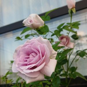 今晩は😃 あらかわ遊園スポーツ ハウス前の薔薇🌹 ブルーバユー 四季咲 淡い藤色が素敵✨