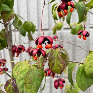 こんにちは🙋♀️ 🏷️「真っ赤な火曜日」に参加致します❣️ ♥️果実が五つに割れて、🧡垂れ下がる ニシキギ科
