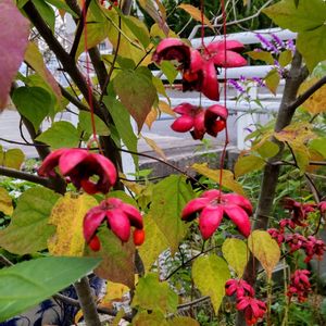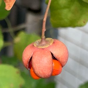 釣花🌳 つりばな 道沿いよそ様庭 寒ー!少し前まで緑だった実が赤くなり、弾けた実から赤い種がぶら〜り❤️❤️🤗