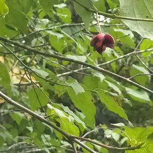 ツリバナ(吊花)ニシキギ科ニシキギ属 ツリバナの赤い実がパカーンと弾けて種が出てました。 1本の木に2、3個しか実はついてませんでした。 可愛い実が見れてラッキーでした。 4⃣ まん丸の実に紅葉した葉っぱ 5⃣ 下 5月4日に咲いてたお花 和名の由来は、長い花柄にぶら下がって花を咲かせるから。 ツリバナの開花は5~6月。小枝の先端にある葉の脇から吊り下がる花や果実には話題性があり、これにちなんでツリバナと名付けられた。花は直径5~7ミリで中央にある緑色の「花盤」が特徴。花には5枚の花弁があり、緑白色あるいは淡い紫色に見える。 9月~11月にできる果実は球形で、直径は1センチほど。花と同じように枝先に吊り下がるが、こちらは朱色でよく目立つ。熟すと果皮が五つに裂け、朱色の仮種皮に包まれた五つの種子が顔を出す。開裂した果皮の先端に踏みとどまる様が面白い。 🏷️ 真っ赤な火曜日