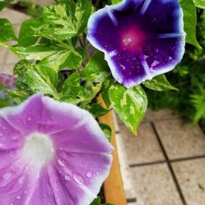 ☔️降ってきました。 先日、変化朝顔見せて頂き、影響受けて変わった園芸種を買いました。 右側のタグで買いましたが、今日ほぼ昼には左の色が咲いてました⁇時間で色変わるの⁇要観察します🔍👀 ほぼ3年ぶりに腰痛になりました🥲 忘れた頃にやって来る、皆さまもお気をつけ下さい💦