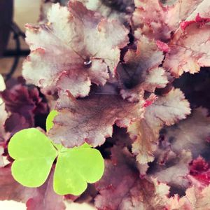 ん?三つ葉☘️?🙄 ヒューケラさんの中にこの黄緑色の ☘️がひょっこり顔を出してました〜💚 綺麗なきみどりに思わずパチリ✨